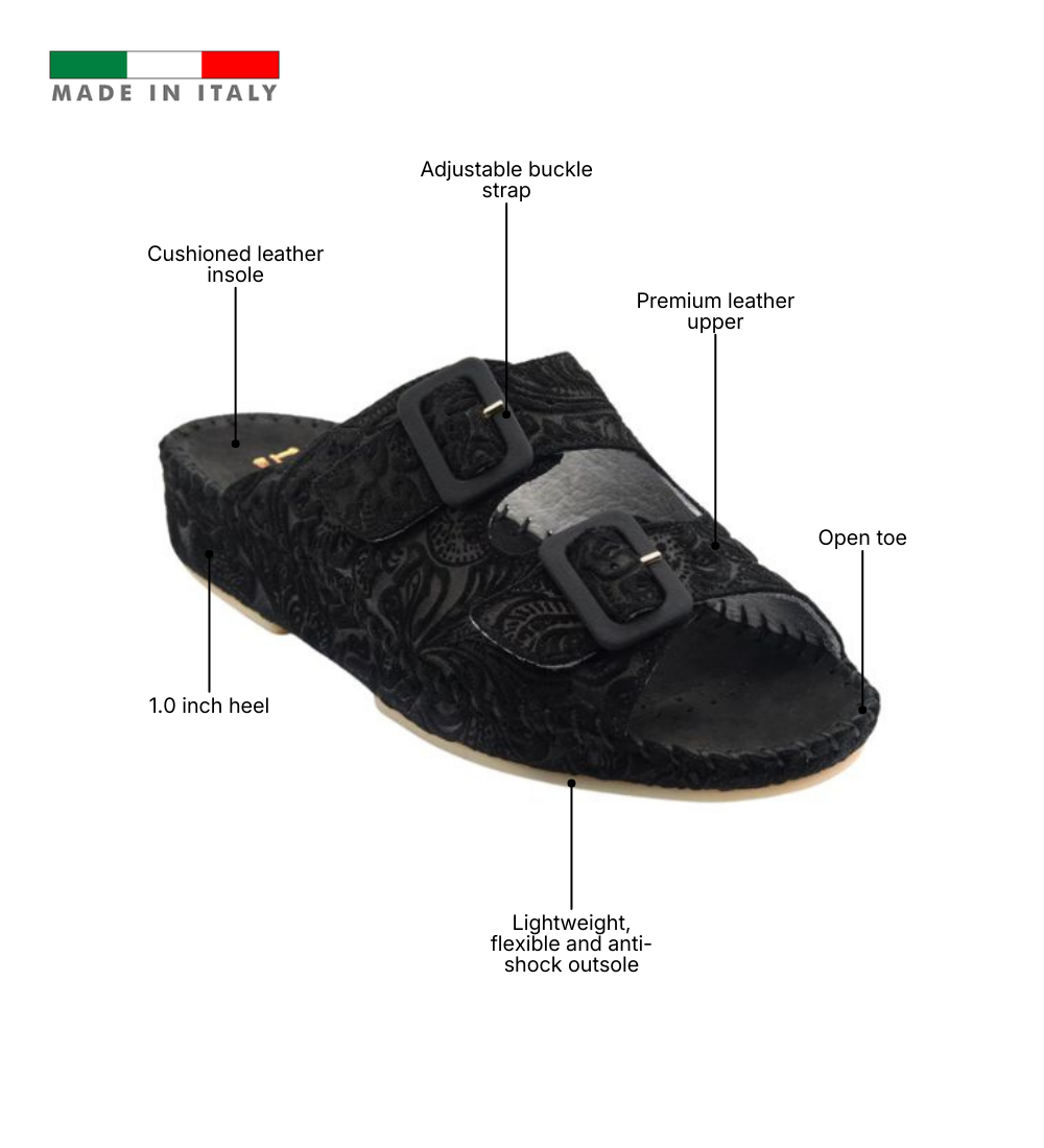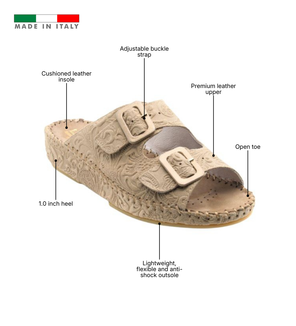 The La Plume Jen Floral Stamped Women’s slide is an Italian comfort classic reimagined with artisanal detail. Handcrafted in Italy from premium leather, this edition features an intricate tooled floral stamped pattern that adds vintage elegance to its refined silhouette. Designed for superior wellness, it is built with a firm leather anatomical footbed featuring integrated arch and metatarsal support to promote healthy alignment and lasting stability. Finished with a flexible anti-shock sole and an adjustable buckle strap for a tailored fit, Jen delivers timeless craftsmanship with everyday support.