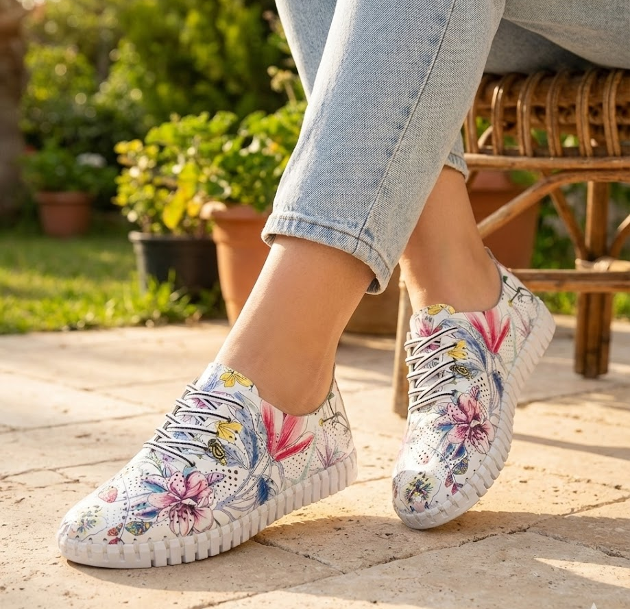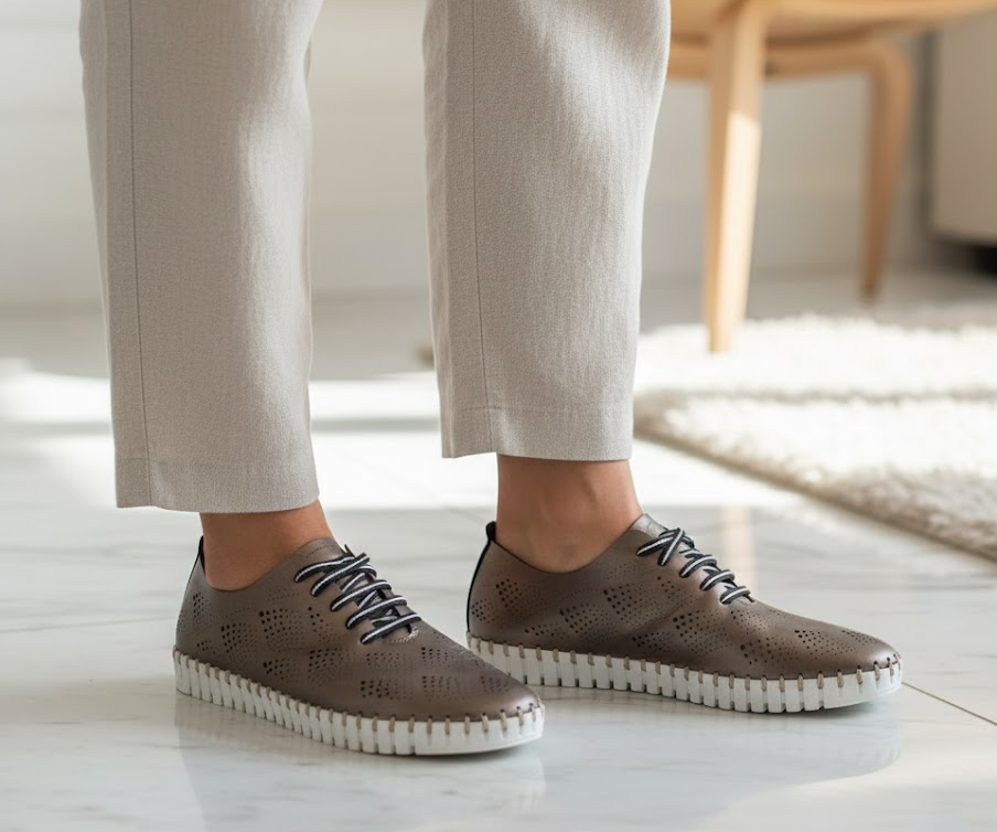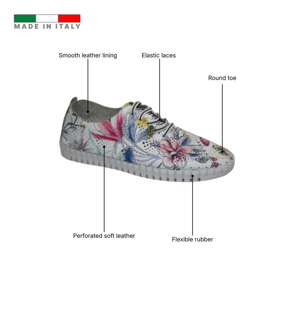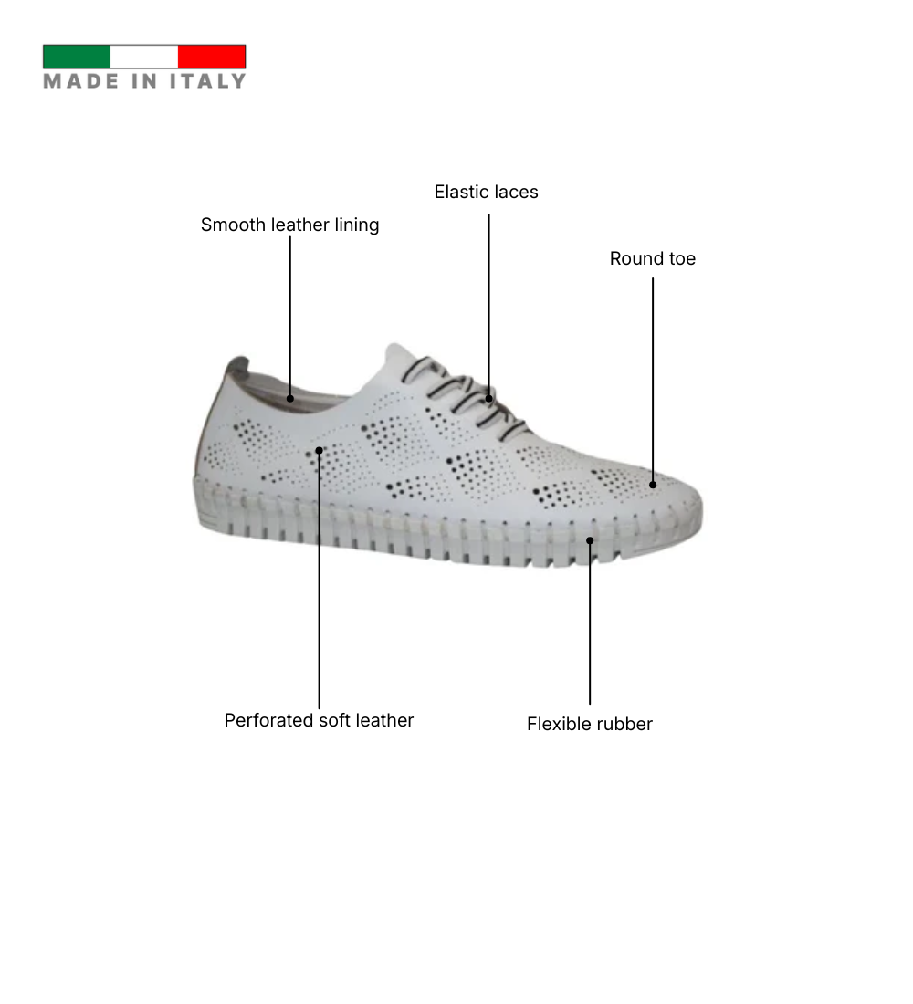 The Eric Michael Annie Women’s Sneaker combines casual style and all-day comfort with a soft leather or nubuck upper, often featuring perforated panels for breathability. Decorative whipstitching and elastic laces provide a slip-on convenience while allowing a flexible, custom fit without tying. The shoe includes a removable cushioned footbed and a flexible rubber outsole, making it lightweight at approximately 8 ounces and perfect for extended wear. Designed to fit true to size for most feet, the Annie balances effortless style with practicality, ideal for casual outings or everyday errands.