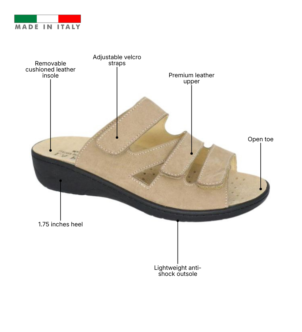 Experience ultimate comfort and style with the Doris Sandal. The high-quality leather upper with its adjustable straps ensure a secure and customized fit. The Doris features a  removable footbed, a perforated, leather-lined insole designed for moisture absorption and superior comfort. The removable feature allows you to easily fit your orthotics into the shoe. Crafted with meticulous craftsmanship, the Doris Sandal is designed to keep your feet happy, dry, and beautiful all day long.