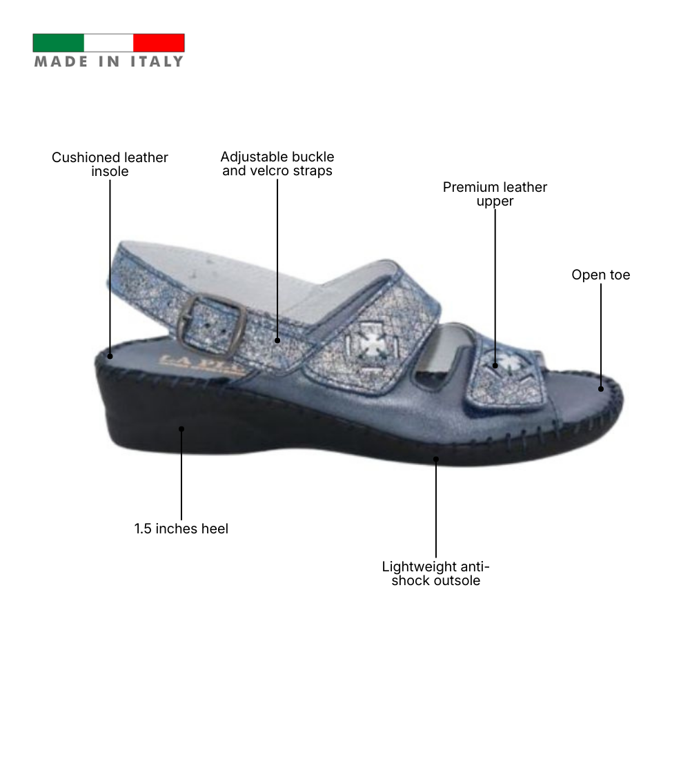The La Plume Dusty sandal blends contemporary texture with signature Italian comfort. Crafted from premium multi-textured leather, this open-toe style features adjustable hook-and-loop straps for effortless wear and a secure fit. The slingback design adds extra stability, while the thickly padded anatomical leather footbed supports all-day comfort. Finished with whip-stitched detailing and a lightweight anti-shock PU outsole, it’s designed for both style and everyday practicality.