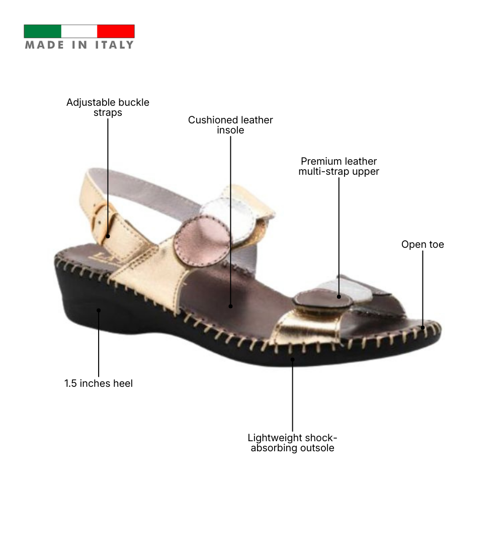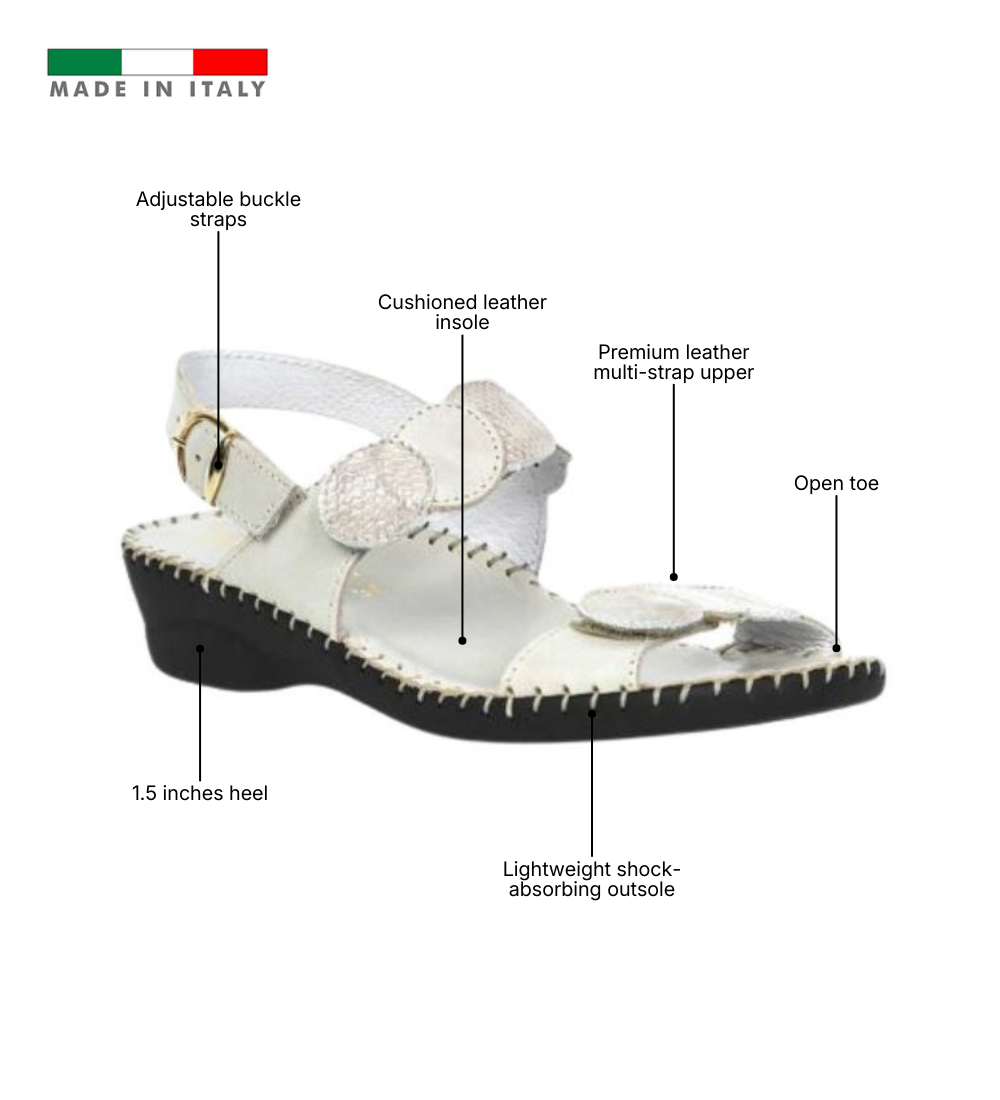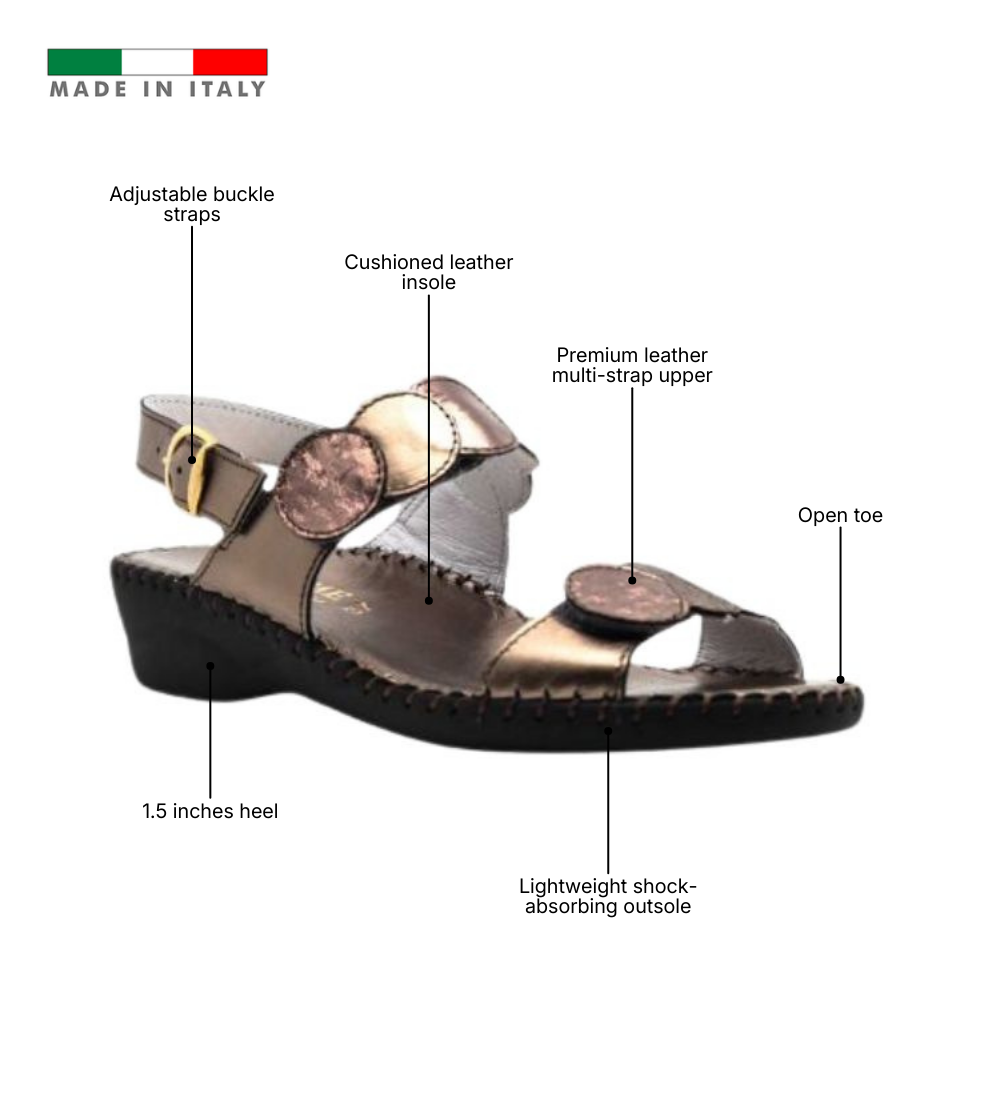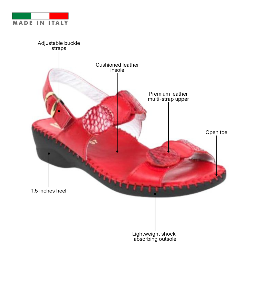 Slip this on and experience total comfort! The Fiora features combination strap textures and a sling back heel strap. The thickly padded leather footbed and the supple leather adjustable velcro straps provide the best fit. Light traction maintains a non-slip grip over any surface, making this sandal the most practical around.