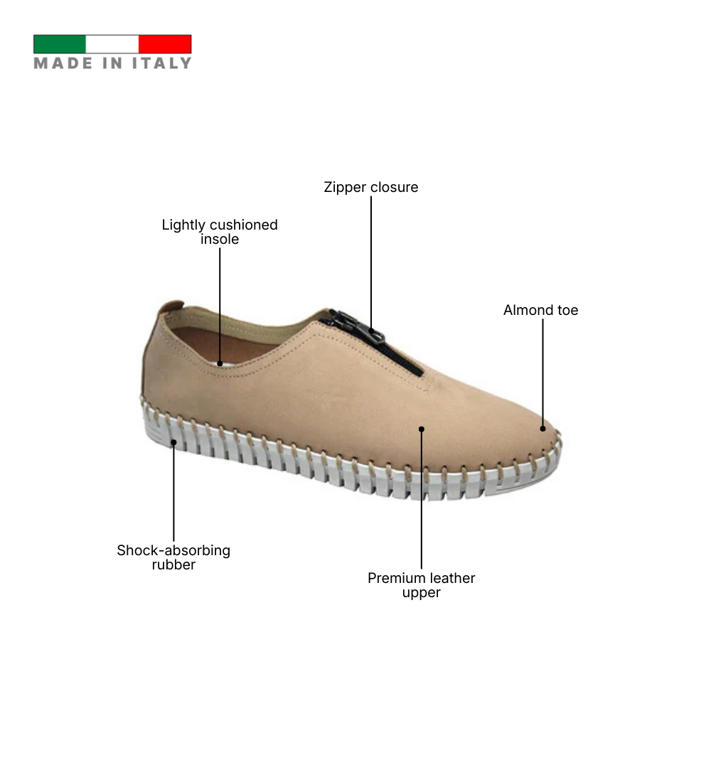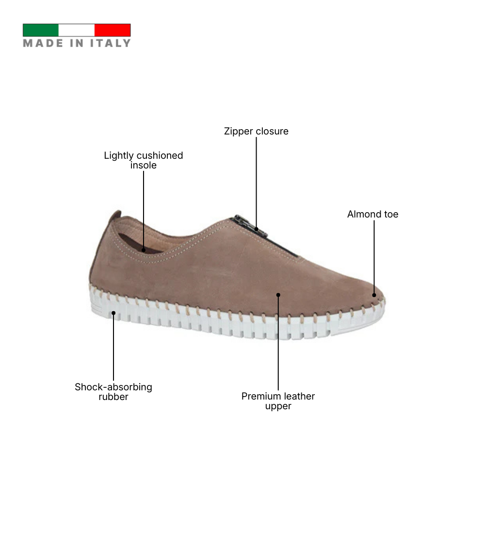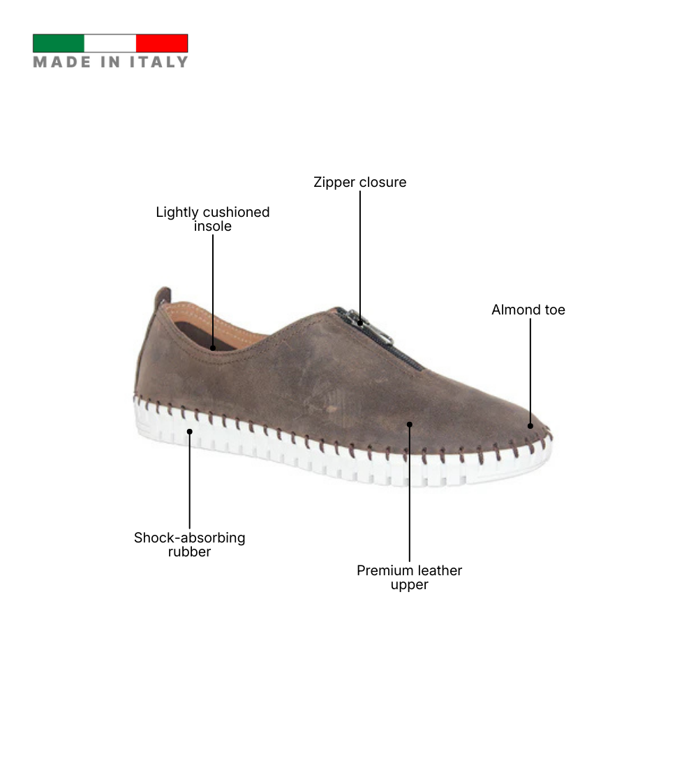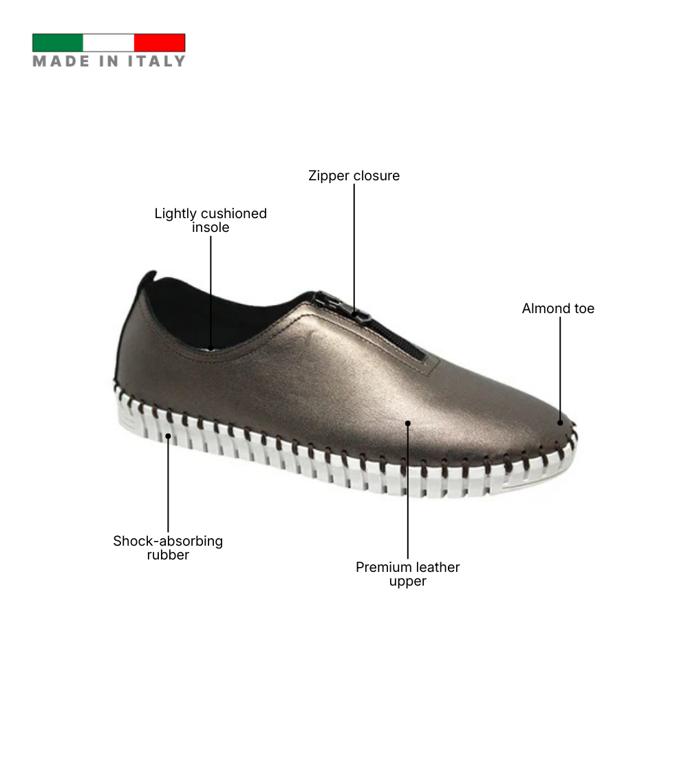The Eric Michael Marlo is a refined slip-on sneaker that perfectly balances Italian sophistication with everyday functionality. Expertly handcrafted in Italy from premium leather, this shoe features an easy zipper closure and a shock-absorbing rubber sole, making it an ideal choice for the modern woman who values both effortless style and all-day comfort.