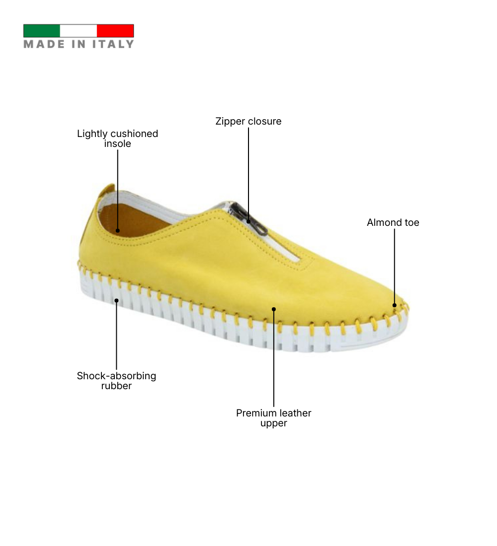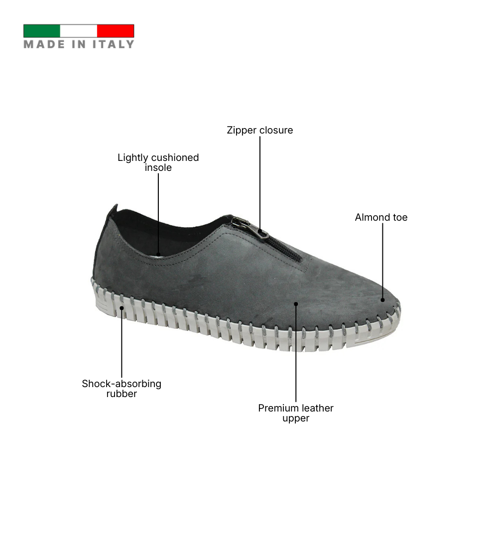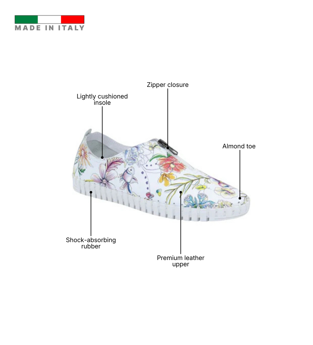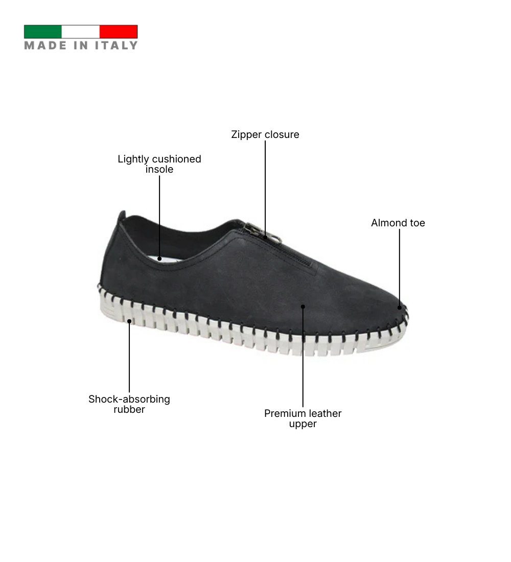 The Eric Michael Marlo is a refined slip-on sneaker that perfectly balances Italian sophistication with everyday functionality. Expertly handcrafted in Italy from premium leather, this shoe features an easy zipper closure and a shock-absorbing rubber sole, making it an ideal choice for the modern woman who values both effortless style and all-day comfort.