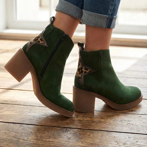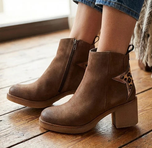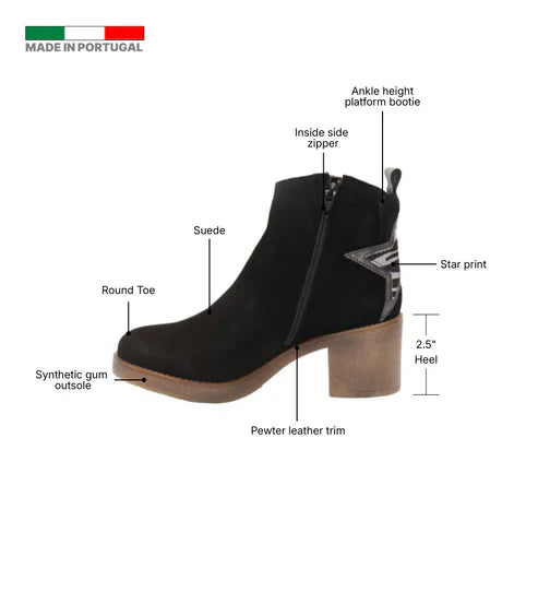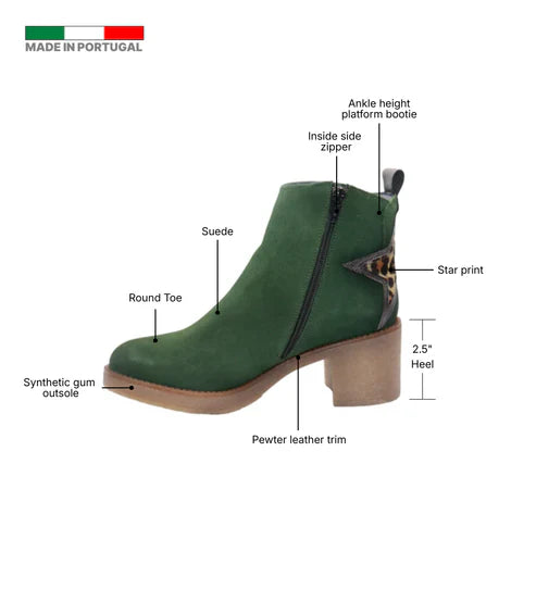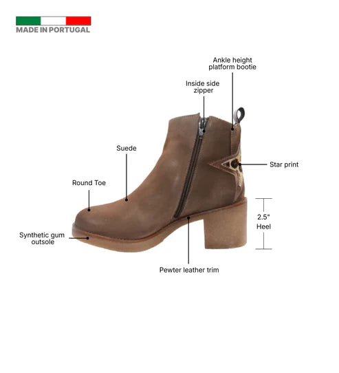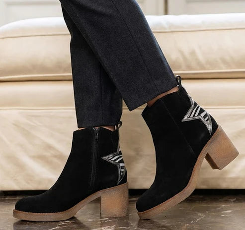 The Eric Michael Perlima boot blends playful detailing with elevated European craftsmanship. Designed in soft suede with a striking star-print calf-hair back panel, this platform ankle boot delivers standout style while maintaining everyday comfort through its removable cushioned footbed and stable block heel.